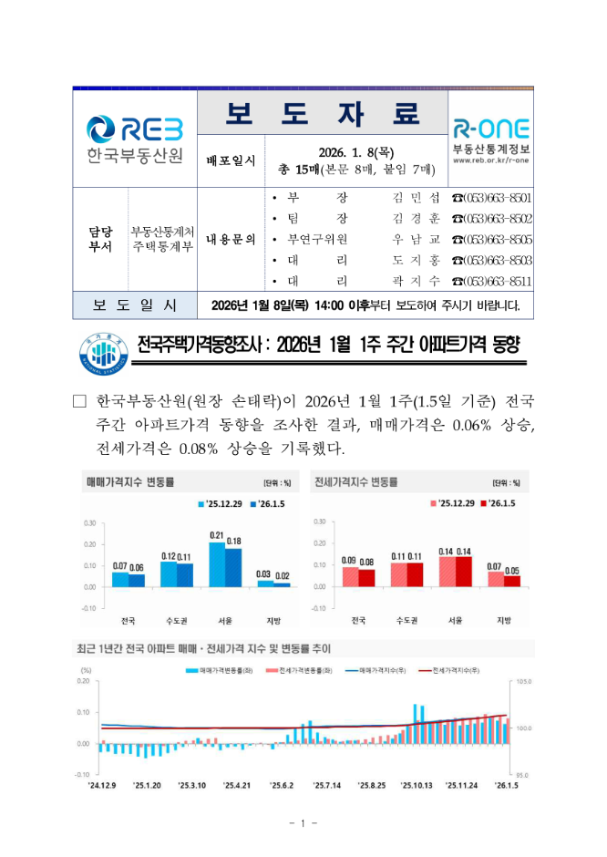 · 주간아파트가격동향 (2026.01.05기준) 분류 : 주택정책 ( 한국부동산원 주택통계부 : 2026-01-09 ) |