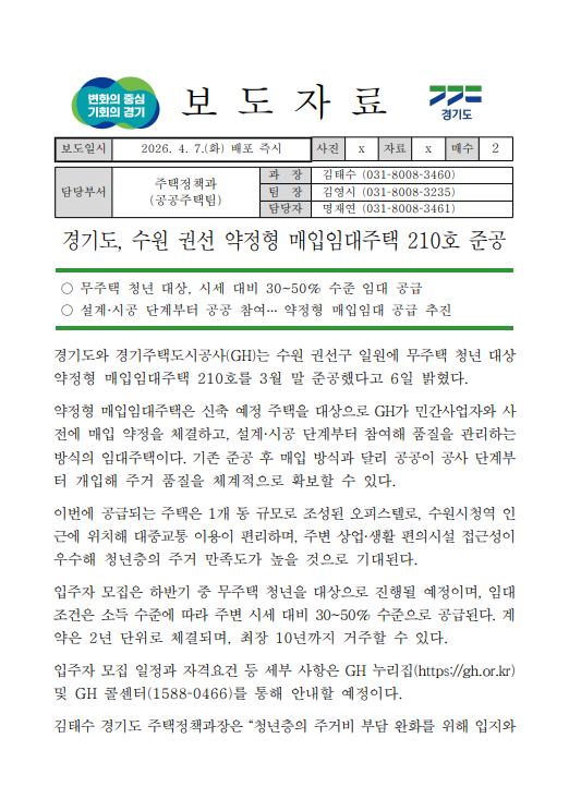 · 경기도, 수원 권선 약정형 매입임대주택 210호 준공 분류 : 주택정책 ( 경기도 보도자료 주택정책과 : 2026-04-09 ) |